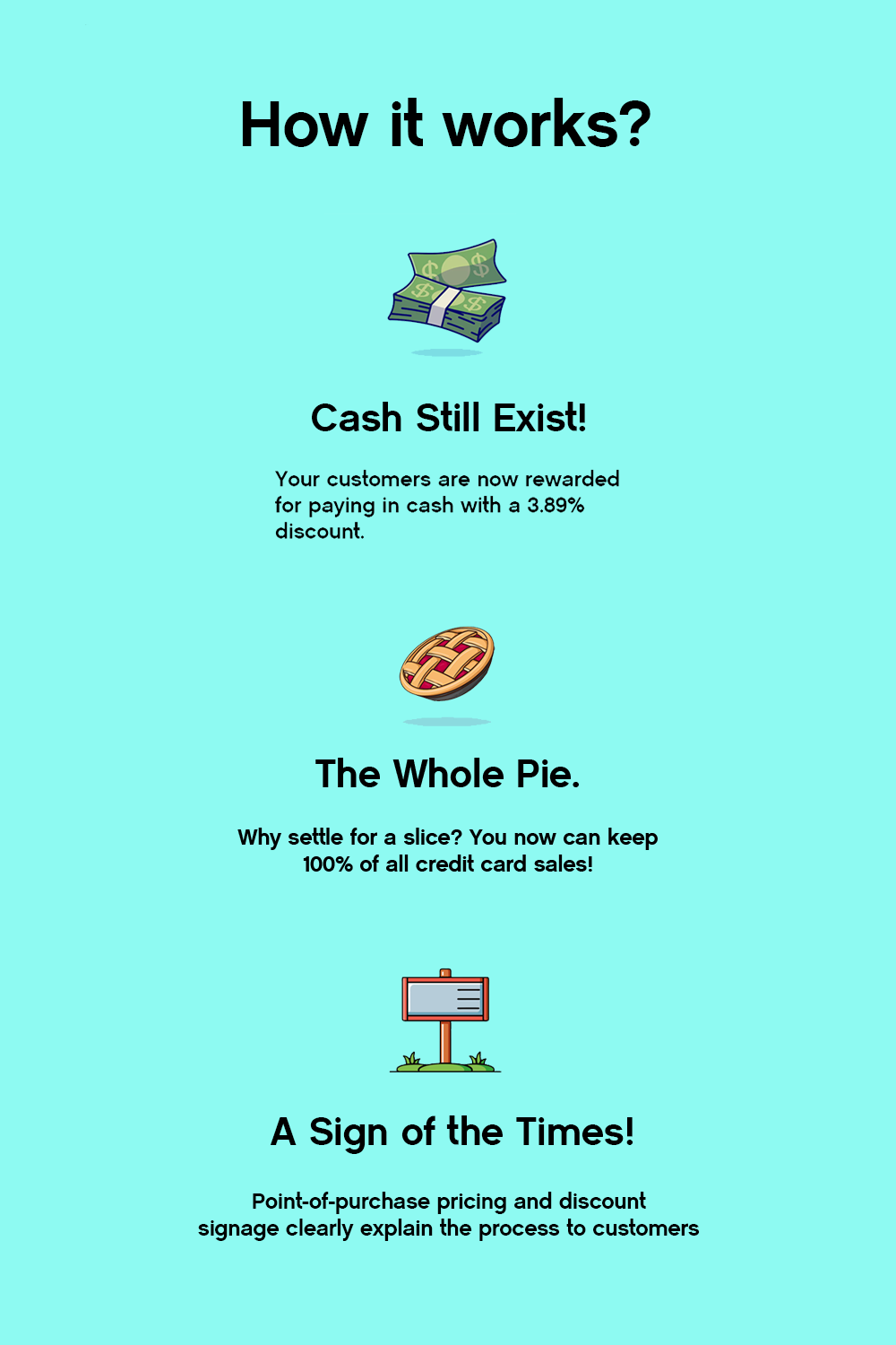 This is the fun part. We’ll send you everything you need in one handy package. You’ll receive a payment terminal, along with signage for your front door and terminal area explaining the discount for cash-paying customers. You’ll also receive free training, as will your sales staff. You’ll also receive a great gift while supplies last.